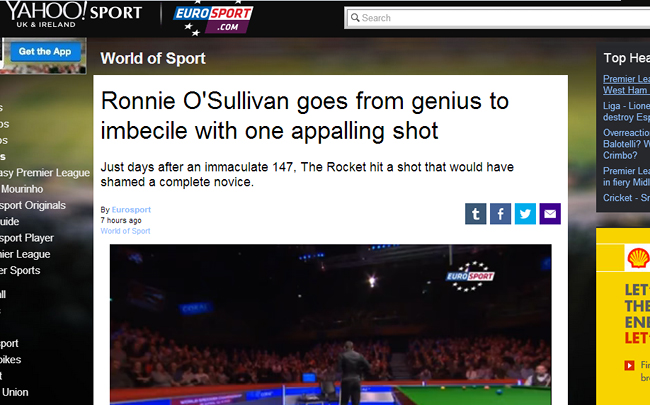Снукерных болельщиков шокировала новость, размещенная на сайте авторитетного спортивного канала Евроспорт о полуфинале Бинэма и О'Салливана. Материал вышел с заголовком "Ронни О'Салливан превратился из гения в идиота из-за одного нелепого удара".